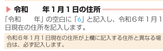ケースB 令和6年1月2日以降に引っ越しをした場合、所得税申告書の現在の住所とと令和6年1月1日の住所(住民税の住所)は異なりますので、下記のように記載をします。