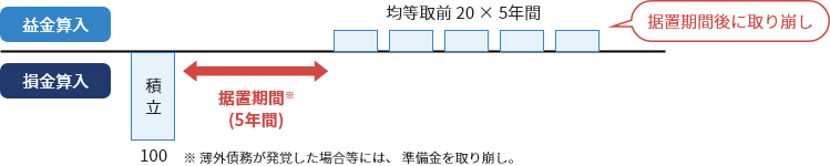 積み立てた準備金は、⑥帳簿価額の減損等の取崩要件に該当する行為を行った場合は、取り崩して益金に算入され、 5年経過後は、 その後の5年間 にかけて均等額で準備金を取り崩し、 益金に算入されます。