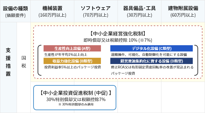 法人税 (※1)について、 即時償却又は取得価額の10% (※2)の税額控除が選択適用できます。 (中小企業経営強化税制)